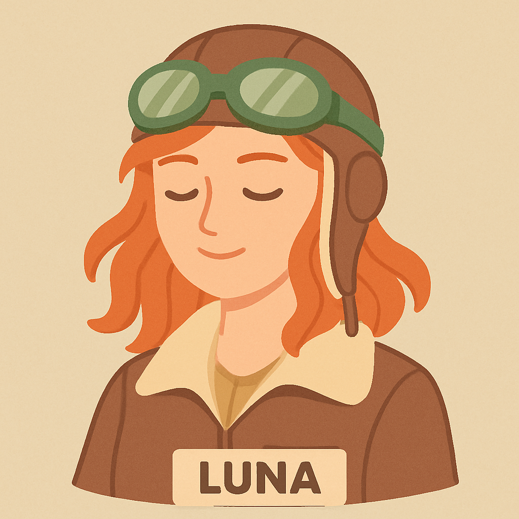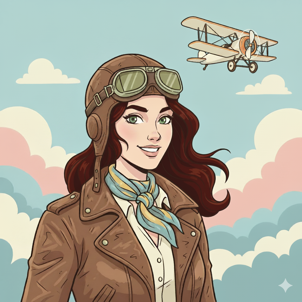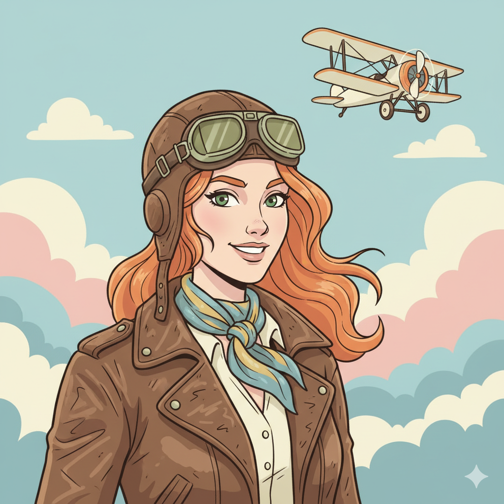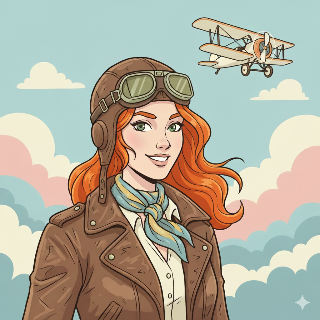 “Generate an illustration of Luna, a red-haired pilot with green goggles and a leather jacket, in a flat pastel art style.”